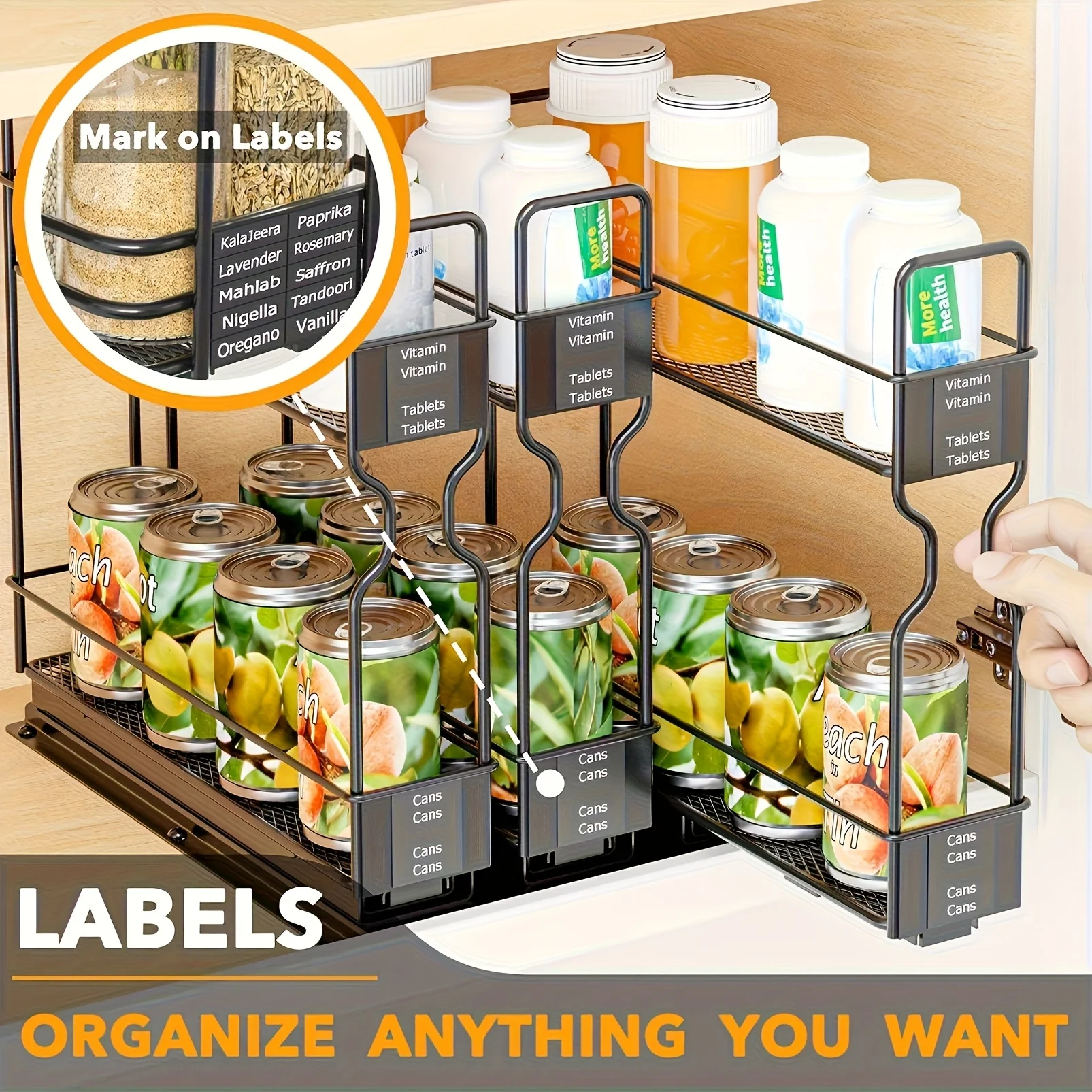 2-piece pull-out cabinet organizer | 5.2 inches x 10.51 inches x 10 inches, equipped with labels, to hold spice jars