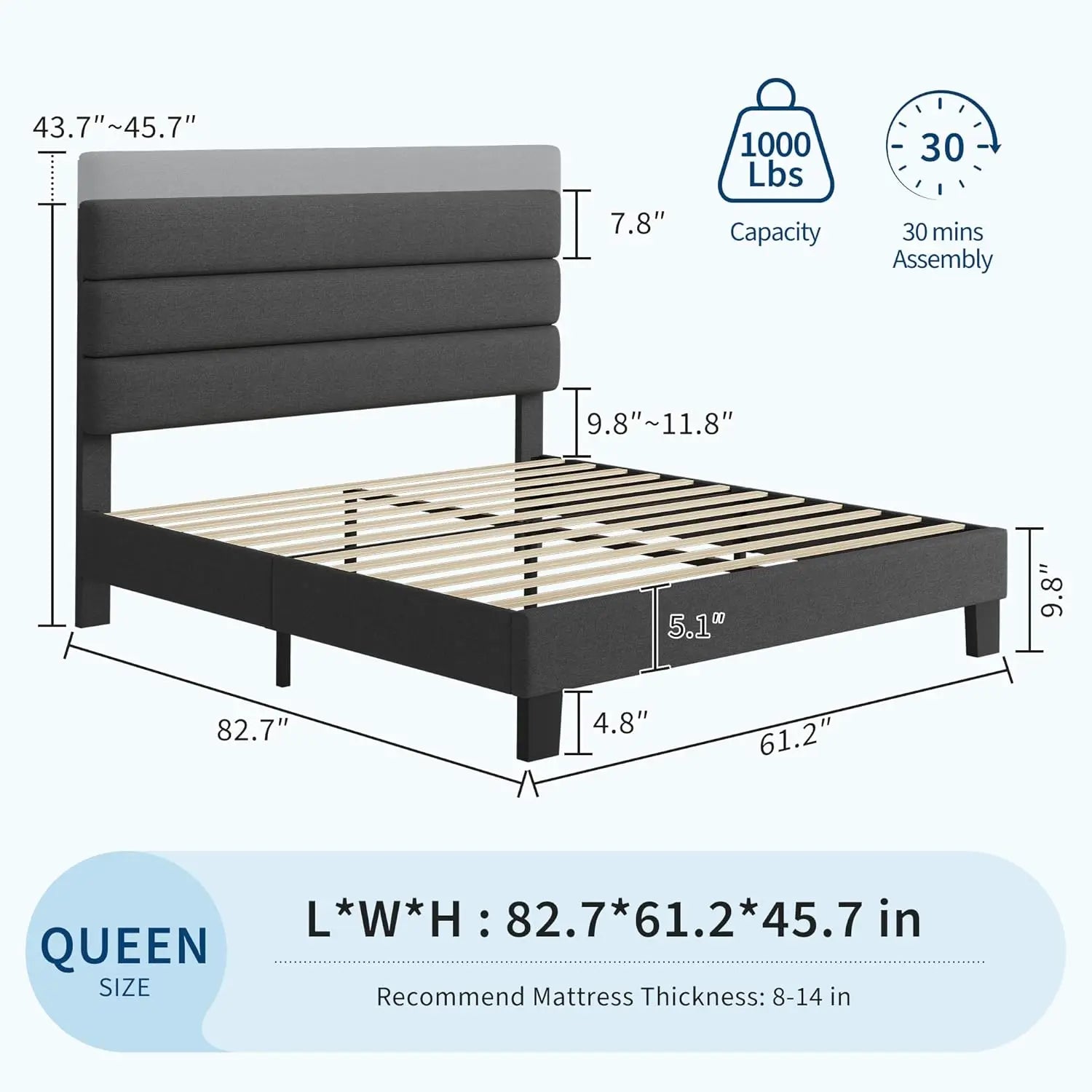 - Adjustable headboard from 43.7 to 45.7 inches lets you tailor back support for reading or TV, compatible with different mattress thicknesses and setups.